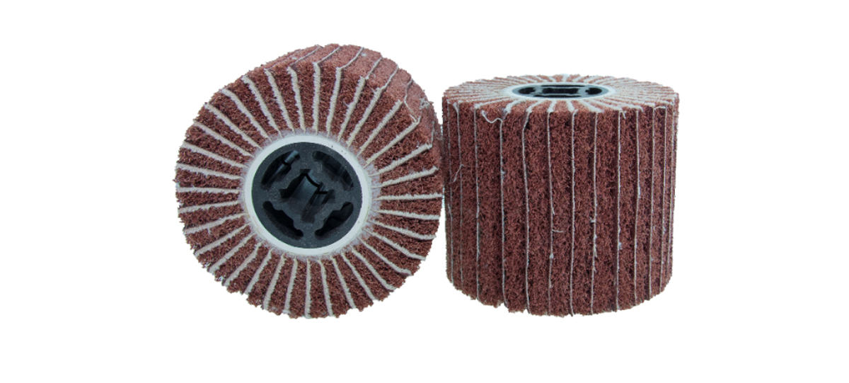 Flap wheel with mixed structure in non-woven abrasive cloth for satin finishes and matt effects on metals, with stock removal.